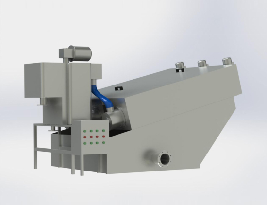 設備運行時,污泥從進料口進入濾筒后受到螺旋軸旋片的推送而向卸料口移動,由于螺旋軸旋片之間的螺距逐漸縮小,因此污泥所受的壓力也隨之不斷增大,并在壓差作用下開始脫水,水份從固定板與活動板的過濾間隙流出,同時設備依靠固定板和活動板之間的自清洗功能,清掃過濾間隙防止堵塞,泥餅經過充分的脫水后在螺旋軸的推進作用下從卸料口排出。